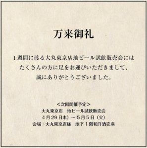 2月11日から17日まで、1週間にわたる大丸東京店地ビール試飲販売会にはたくさんの方に足をお運びいただきまして、誠にありがとうございました。